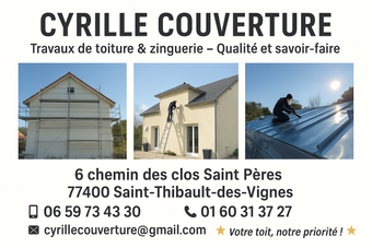 Cyrille Couverture est une entreprise de couverture basée à Bussy-Saint-Georges, et saint-thibault-des-vignes en France. Nous sommes spécialisés dans l'installation, la réparation et l'entretien de toits en zinc, tuiles et fenêtres de toit. Notre équipe qualifiée et expérimentée est à votre service pour répondre à tous vos besoins en matière de couverture.